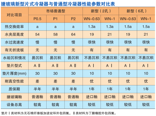 1、搪玻璃冷凝器可處理除氫氟酸、光氣、濃硫酸(濃度>30‰,溫度>180℃)、強(qiáng)堿(溫度>100℃)及一切含氟離子外的化工介質(zhì)。 2、體積小、重量輕、結(jié)構(gòu)緊湊,通過熱氣流和冷卻水的逆向流動(dòng)進(jìn)行熱交換。 3、經(jīng)過一定的使用期限后,如發(fā)生部件損壞,可進(jìn)行局部替換或減少單片,不會(huì)造成整臺(tái)設(shè)備報(bào)廢或停產(chǎn),延長(zhǎng)了整臺(tái)設(shè)備的使用壽命。 4、本產(chǎn)品可耐完全限真空(真空度須緩慢增加),且不易結(jié)污垢,與同類搪玻璃片式冷凝器相比,熱交換效率可提高30%—50%。 5、本產(chǎn)品分NW-0.63型和NW-1型兩種。另外每種型號(hào)分為2孔和6孔兩種規(guī)格。NW-2型待開發(fā)。 |
